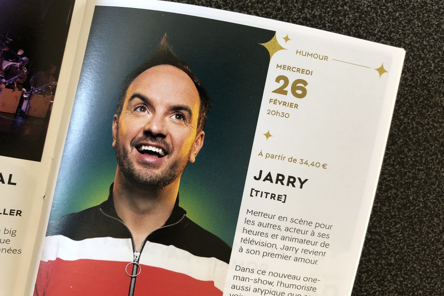 J’ai reçu dans ma boîte aux lettres le catalogue de la nouvelle programmation des spectacles du Casino Barrière de Toulouse. J’imagine que je le reçois car, pour la Saint-Valentin de l’année dernière, ma femme et moi sommes allés voir la pièce de théâtre de Laurent Ruquier « À droite, à gauche » avec Francis Huster et Régis Laspalès. Ç’avait été une bonne soirée. Alors par curiosité j’ai feuilleté le catalogue à la recherche d’une autre opportunité de sortie en couple. Arrivé au 26 février… j’ai explosé de rire, (tout seul dans la cuisine) !.