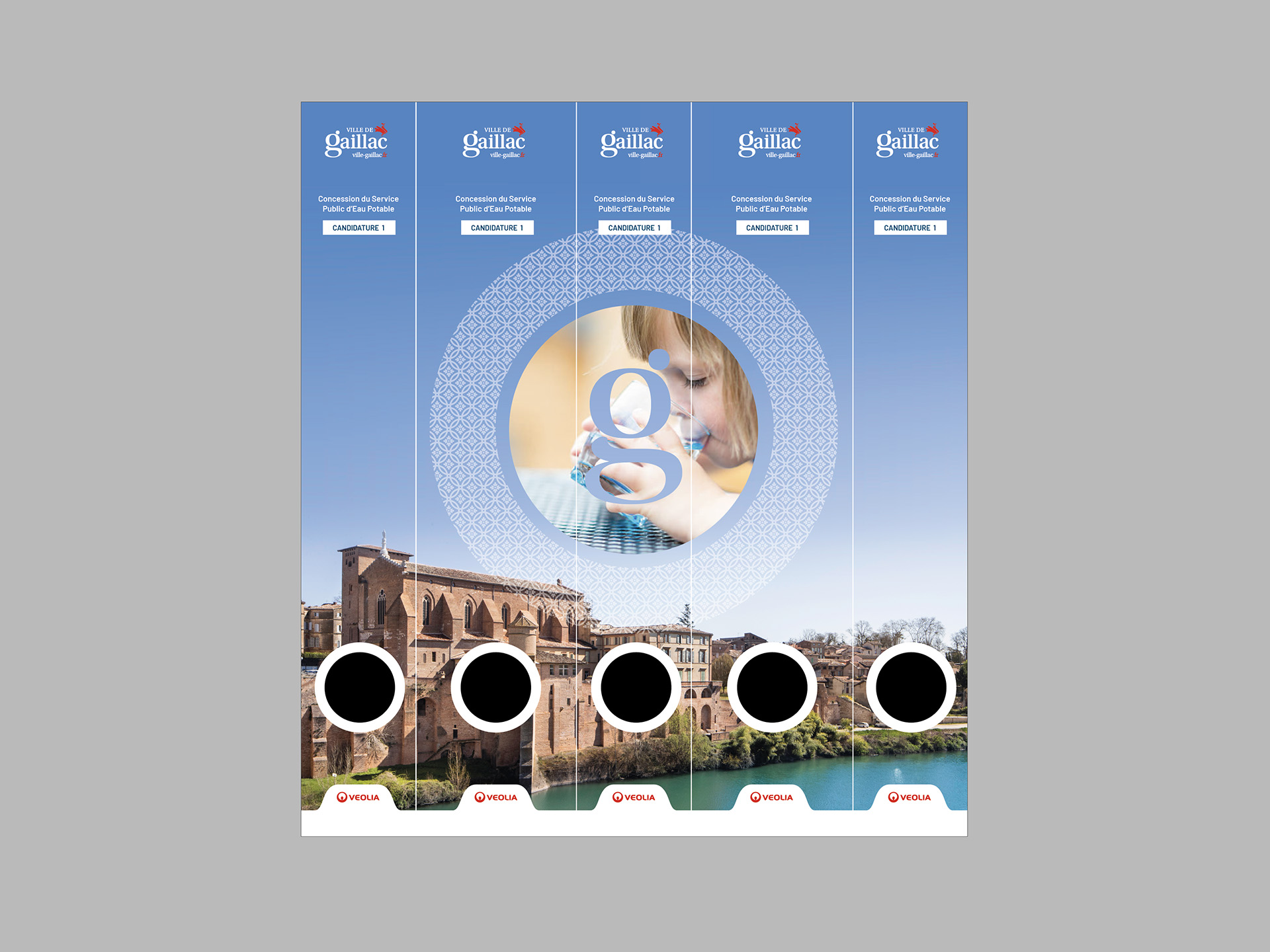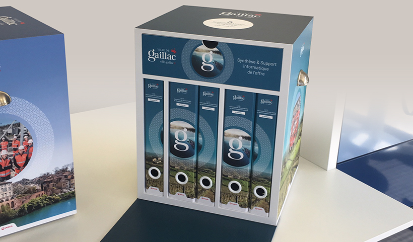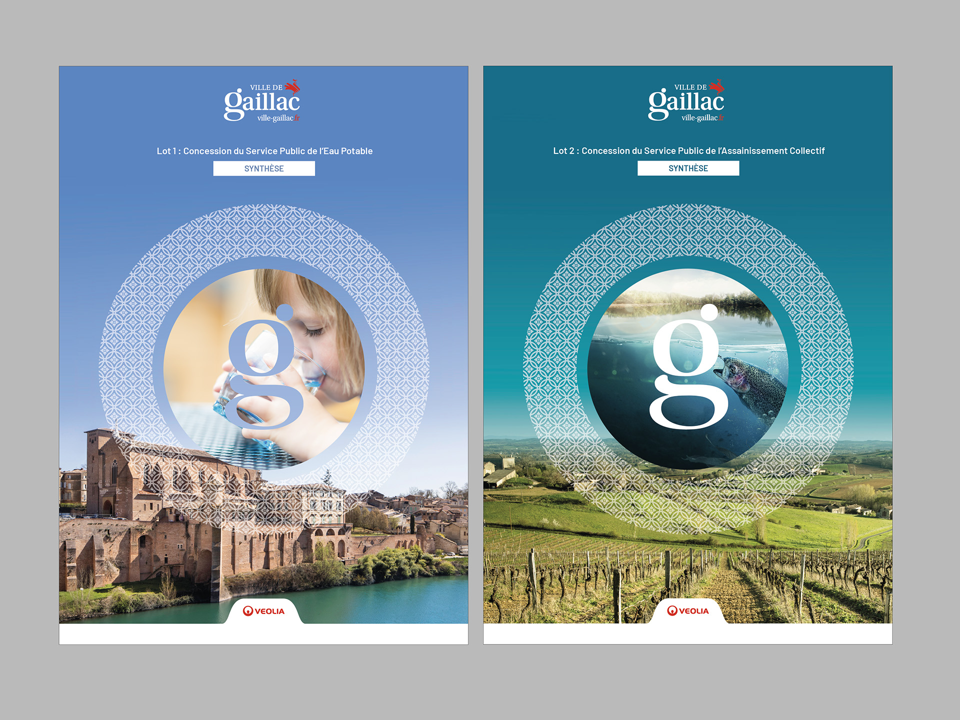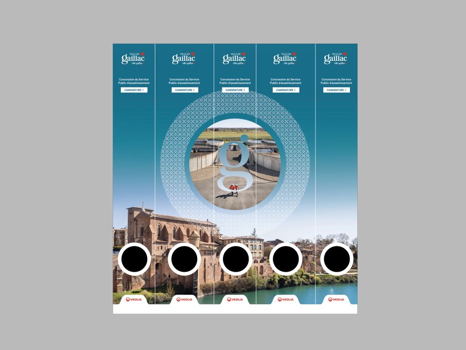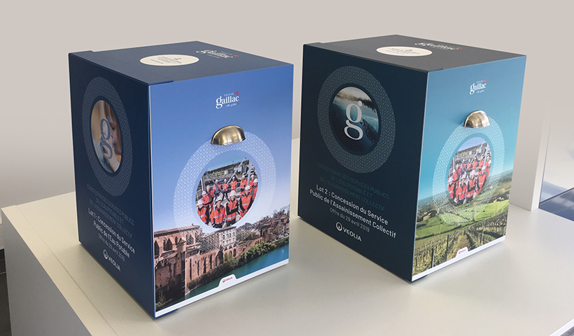 Création graphique des 2 univers (eau potable et assainissement) rendus distincts grâce à une déclinaison colorée. Création d’un motif typé Sud-Ouest pour renforcer l’ancrage local survolant des photos flatteuses de la ville. Les éléments : synthèse, classeurs etc, sont organisés dans une boite faite sur-mesure et reprend le décor spécifique de chaque offre.
