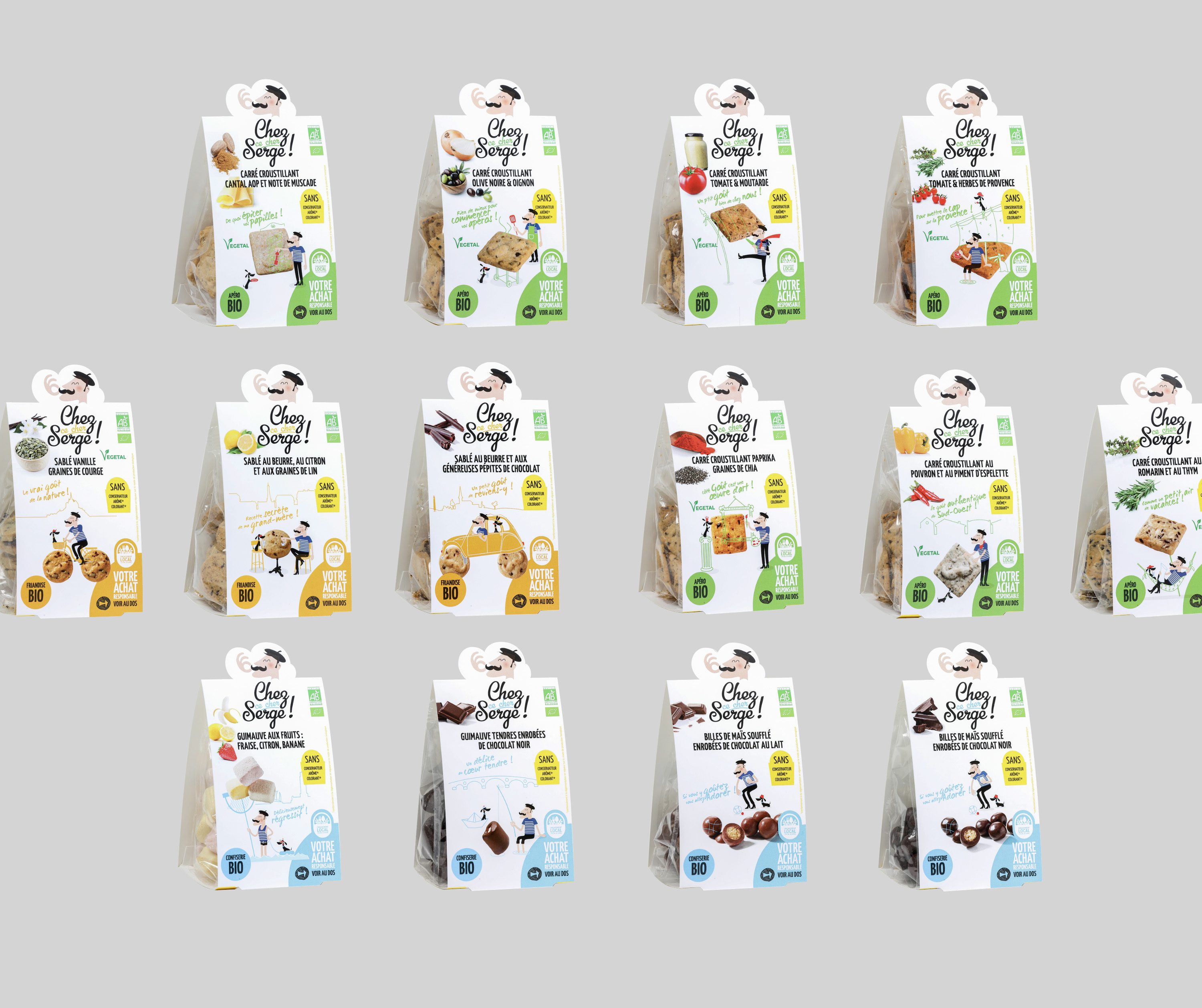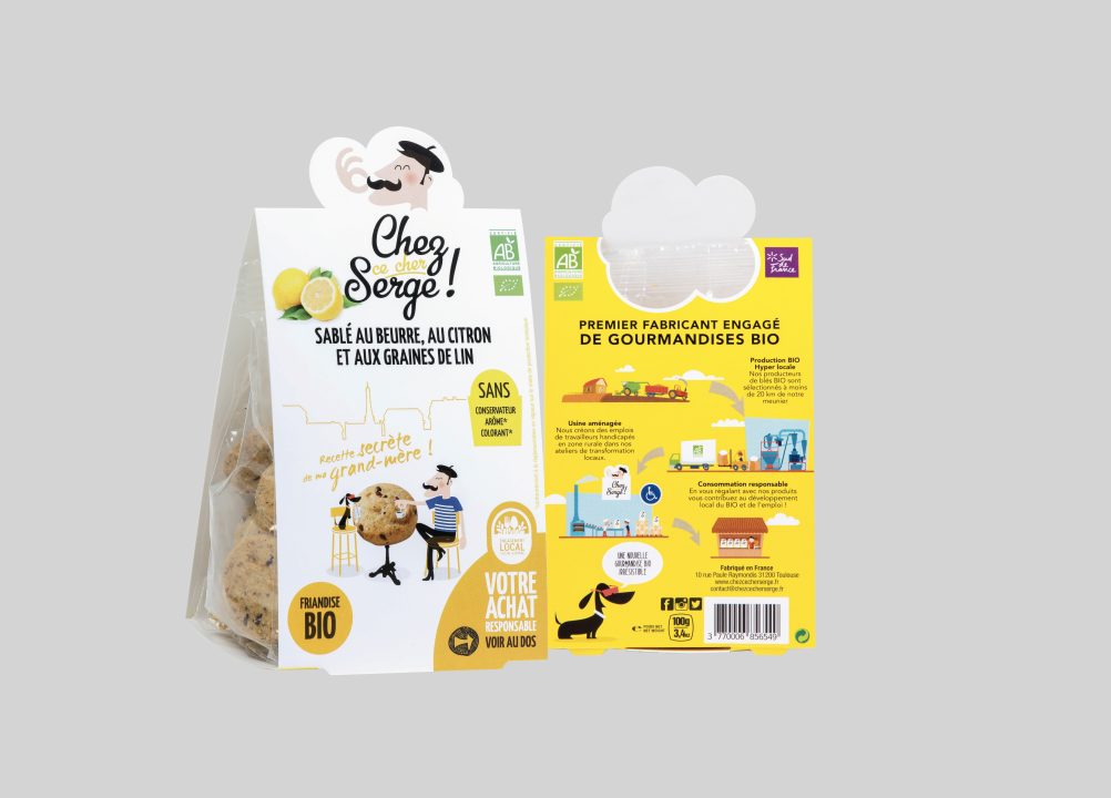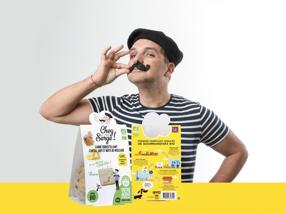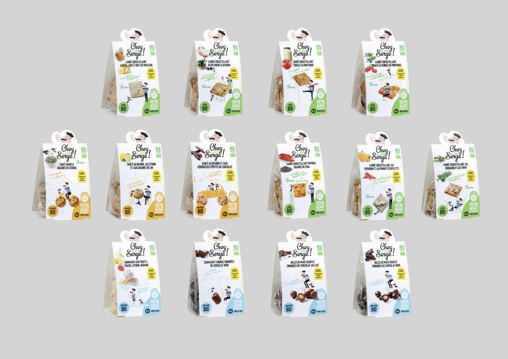 Beaucoup de soleil et de fun pour cette marque de snackings Bio ‘Chez ce cher serge’ à l’image de la start-up toulousaine qui la lance sur le marché. Illustrations décalées, personnages amusants, solutions créatives et économiques… il y a un grain de folie dans le snacking Bio !