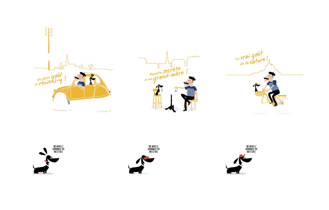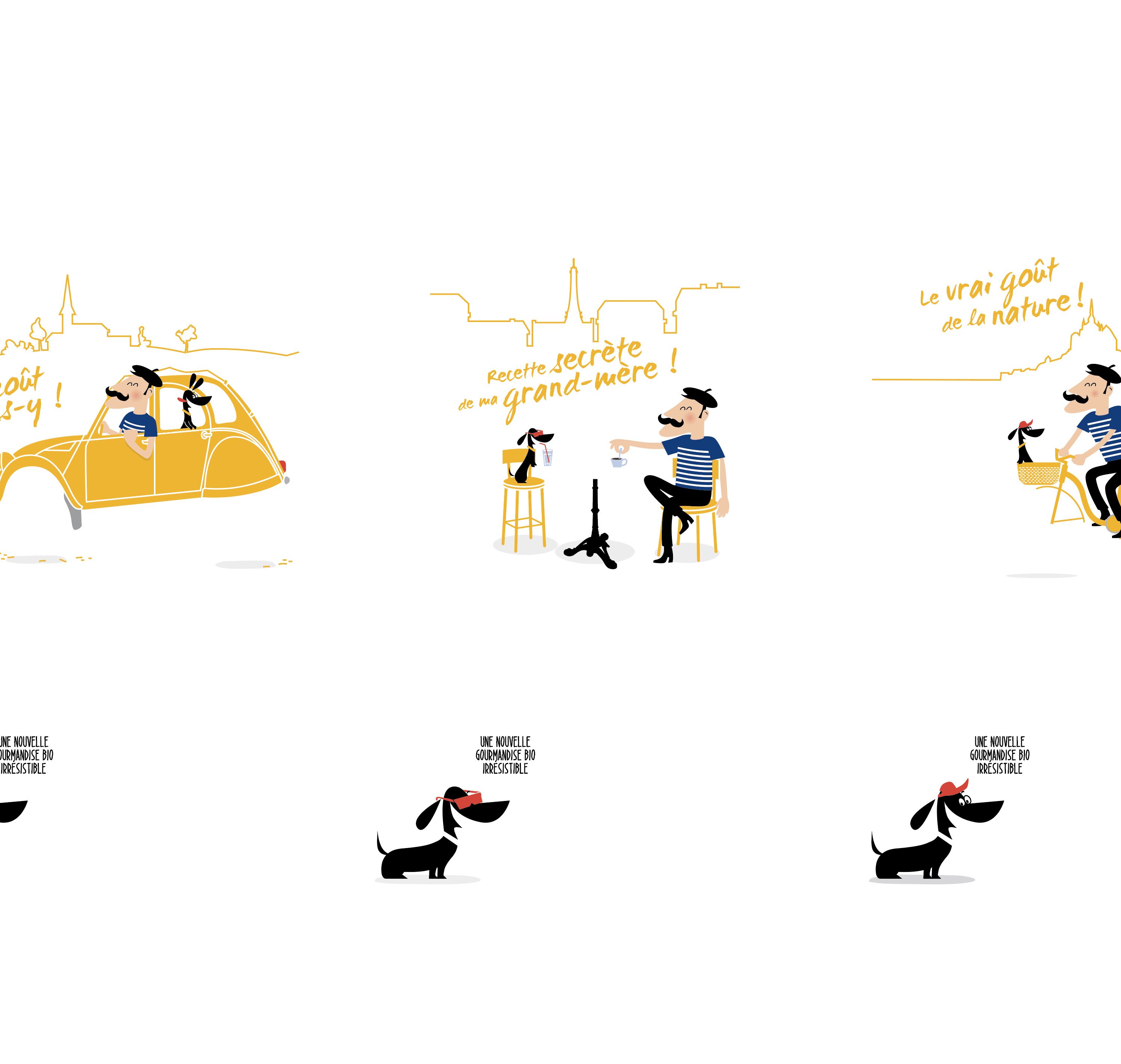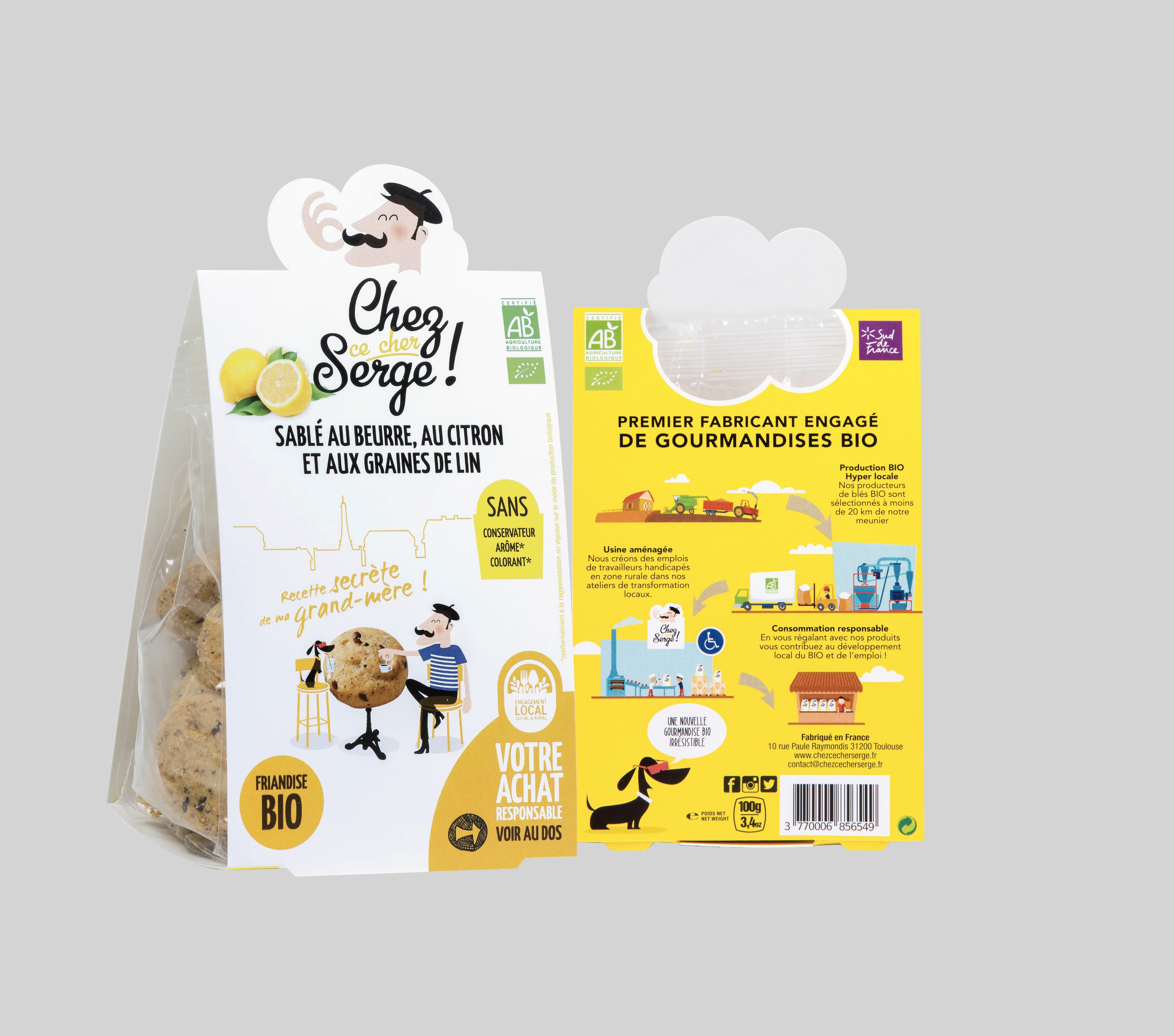 Nous avons créé une mascotte (Serge) et son chien (Chocolat) qui vivent des aventures sur chaque facing. Le packaging est un simple fourreau découpé sur le haut qui protège le sachet non imprimé.