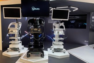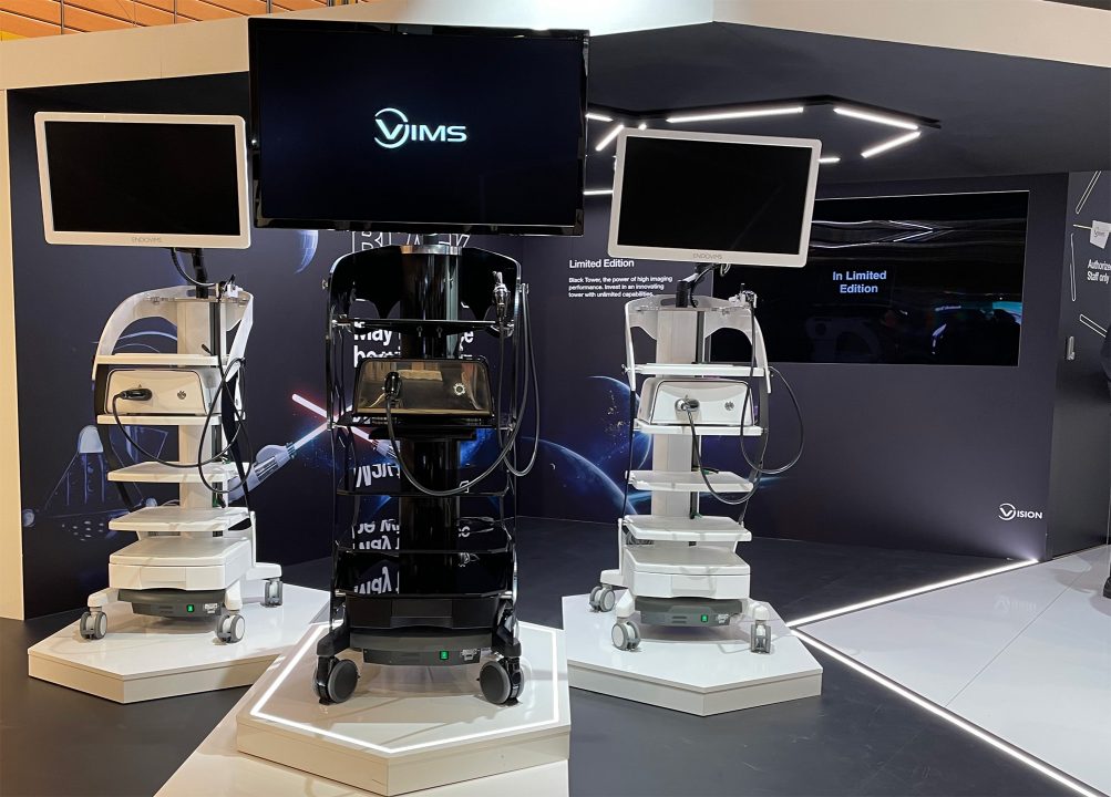 Scénographie d’un stand architecturé de 80m2. La sortie d’une nouvelle colonne d’arthroscopie noire (Black Tower) alors que les autres sont blanches a motivé le client à jouer sur les codes de Star Wars. La surface est divisée en deux côtés. Une grande réserve permet de jouer le rôle de stockage derrière le bar et local technique pour accéder aux 2 écrans. Une casquette au dessus du bar crée un espace plus intime et contribue à séparer les deux univers des machines et des consommables. Des rubans de led incrustés dans le sol en lignes brisées permettent d’éclairer indirectement et structurent virtuellement l’espace.