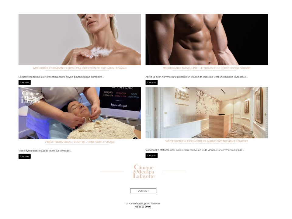 Pour dynamiser le site de la clinique, nous avons créé des articles qui ont été relayés sur les réseaux sociaux pour plus de visibilité. Et nous avons réalisé des vidéos pour illustrer les soins d’hydrafacial et de PRP : prise de vue, montage et post-production.